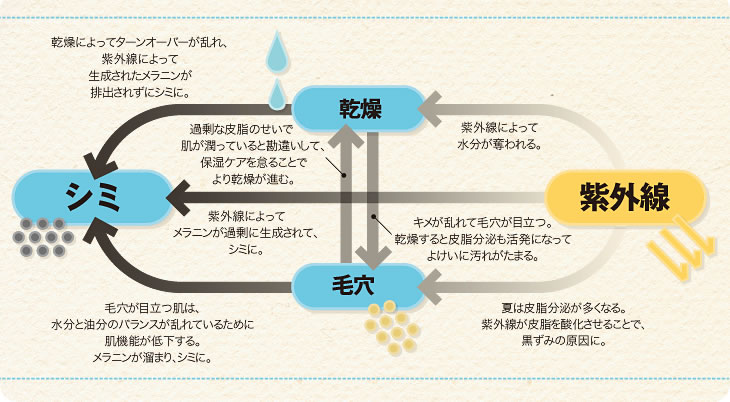 紫外線、乾燥、皮脂による